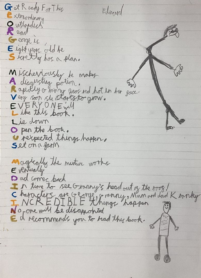 The children are given frequent opportunities in school to write in different styles and for a variety of audiences, using quality texts as a model. Opportunities to use a range of engaging stimuli for writing are regularly provided, including Talk4Writing, music, drama and film; more confident writers are also given regular opportunities to write more freely about a topic or in a style of their choice through our 'Freedom Friday' challenges.