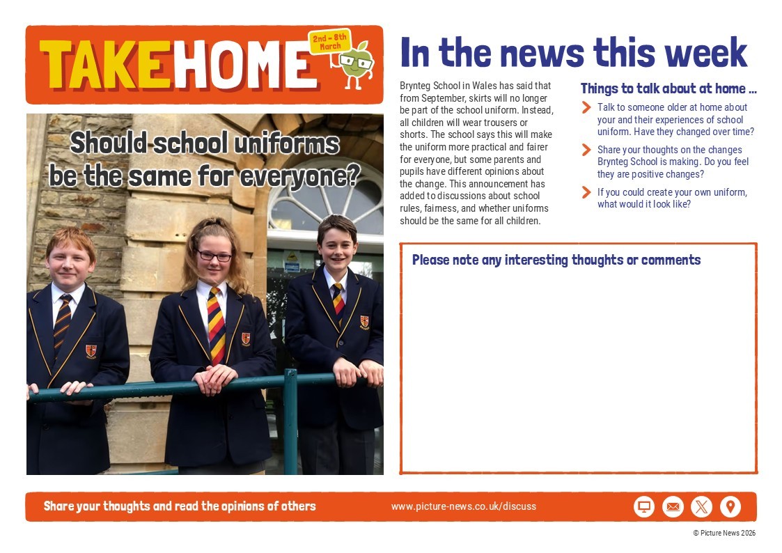 Primary Picture News is a child-friendly look at some of the events going on around the world. This week, the children heard about different school uniforms. Ask your child about the story using some of the conversation starters above.