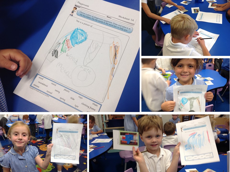 We talked about our favourite things to play on and discussed how they were made, including what shapes we could see and which materials were the most common and why. The children then drew and labelled their favourite pieces of play equipment, including the materials used in their construction.