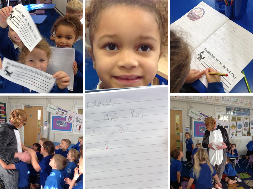 We've been exploring the story of Little Red Riding Hood recently, encompassing role-play, using adjectives to describe the characters, and even having a debate as to where the Big Bad Wolf would rank on a list of villainous characters from familiar tales. Imagine our surprise when we got a message from the Big Bad Wolf explaining that he'd changed his ways, become a vegetarian and wanted to come into school to talk to the children! The class came up with lots of questions they'd like to ask him and were very welcoming to our visitor who had, indeed (thankfully) changed his ways.