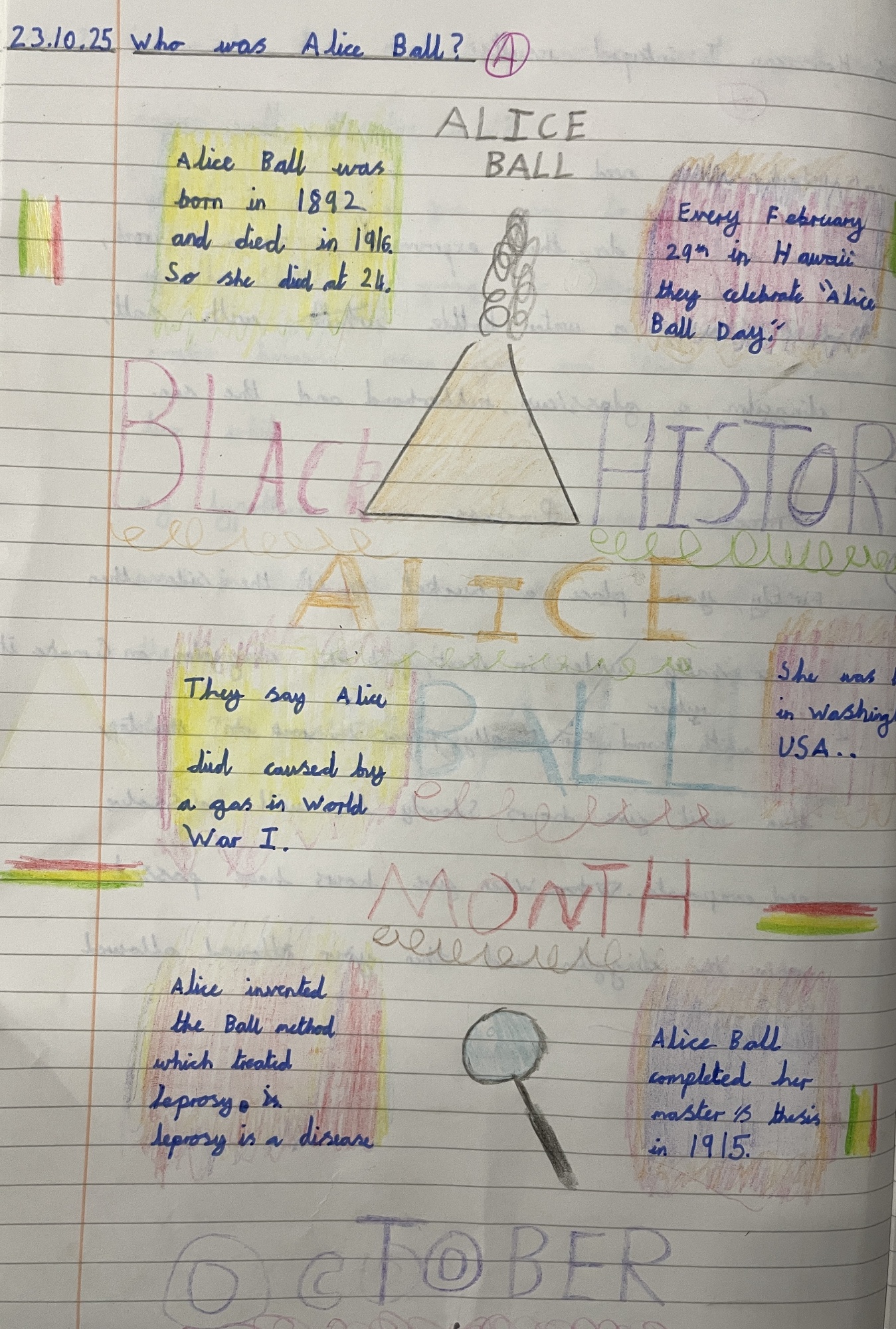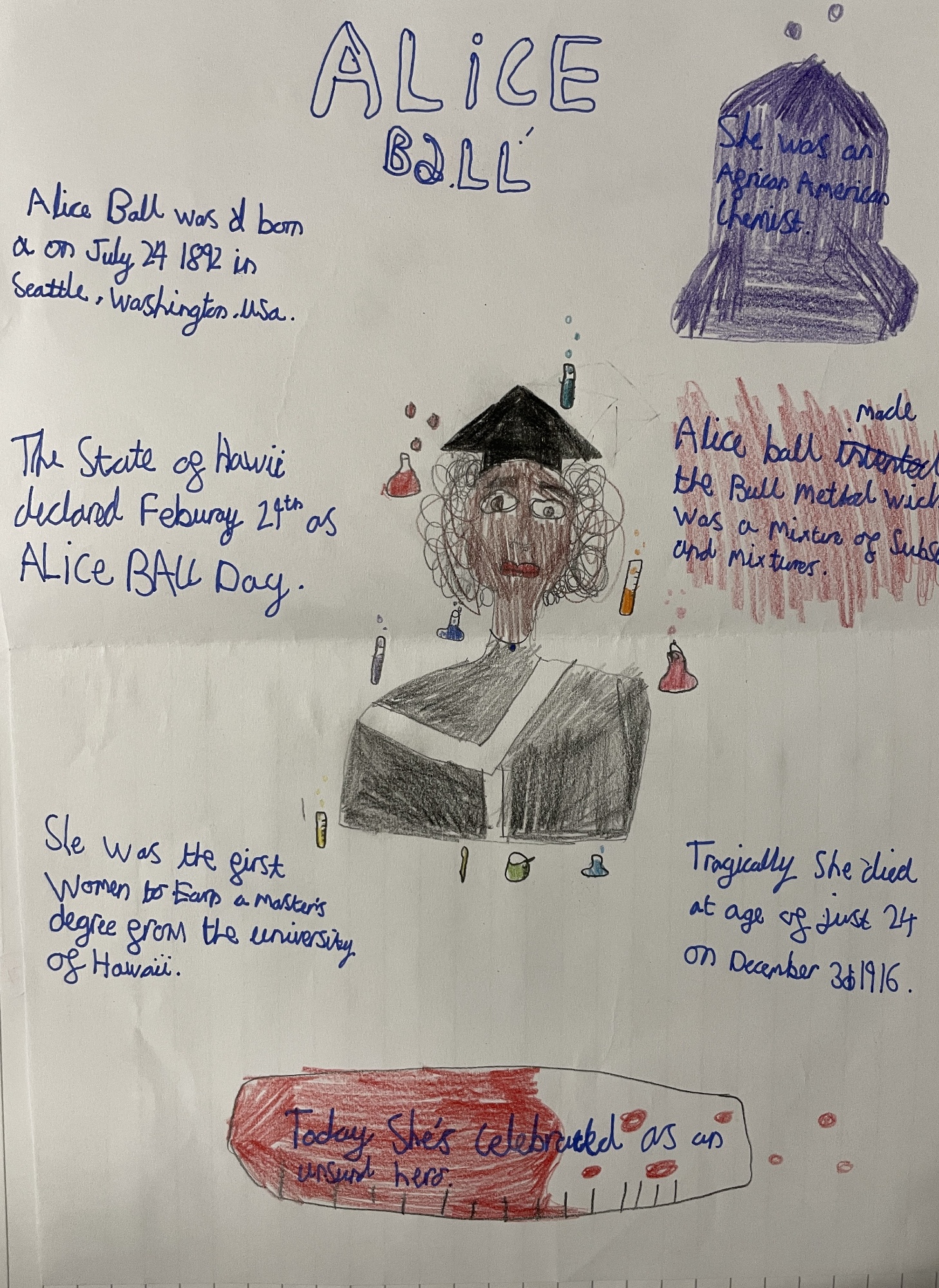 This week, we learnt about Alice Ball, a famous black female scientist who was the first black woman to graduate from the University of Hawaii. She developed the Ball Method, a way of treating leprosy. To showcase our learning, we made one pagers, thinking about the important information we wanted to capture on the page, as well as how to make it engaging and interesting for the reader. Some great examples are below...