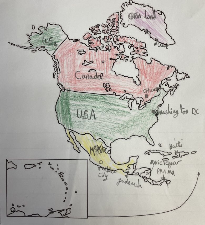 Over the past couple of weeks, we have been exploring North America in Geography, using maps and Google Earth to locate the continent, discover the countries and capital cities. In one lesson, we focused on working out how you would get to North America from the United Kingdom using a compass. Then, in this week's lesson, we focused on the various countries across North America, their capital cities and then wrote sentences describing how you could get from Canada to Panama.