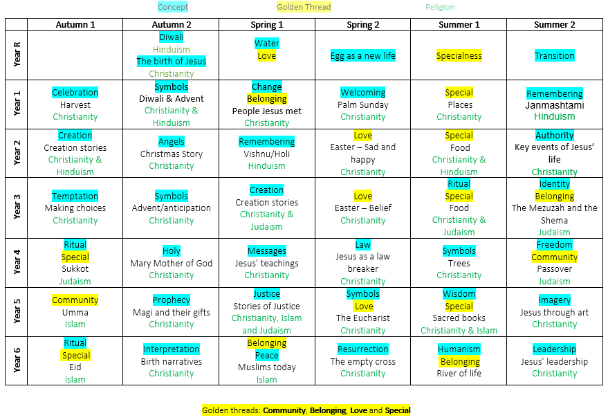 There are also ‘golden thread’ concepts : belonging, communicating, special and love, which are revisited throughout the key stages, each time gaining a greater depth of enquiry.