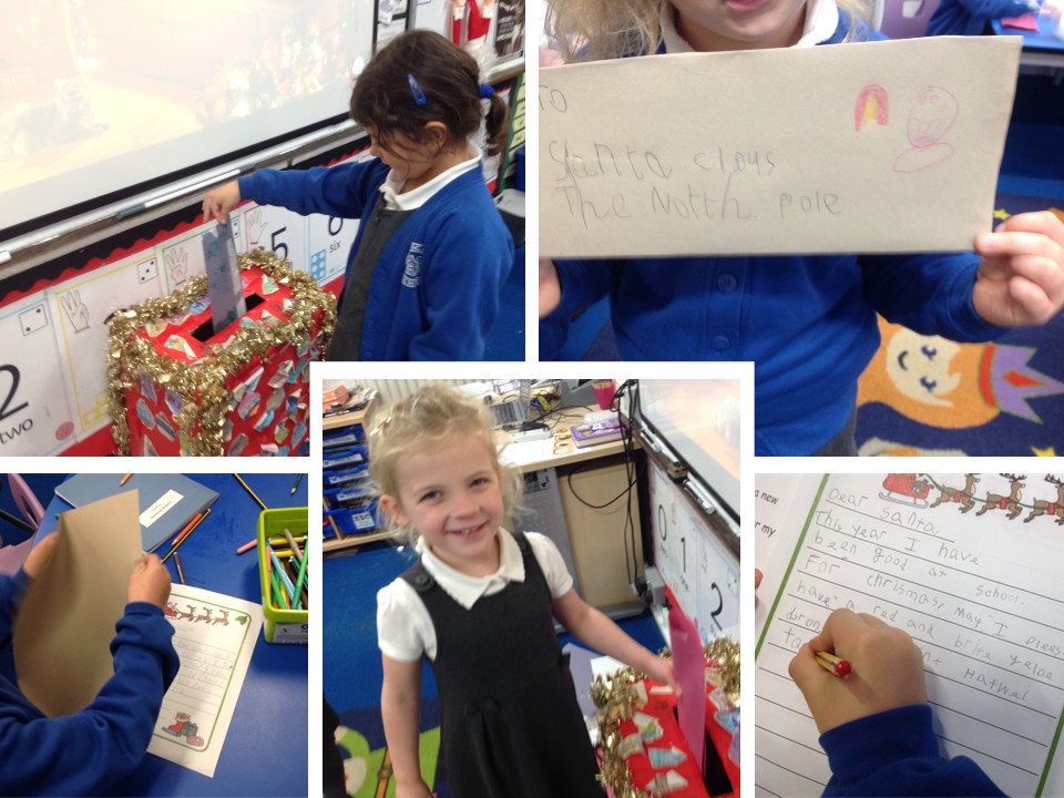 The children have been writing their letters to Santa Claus, telling him what they might like for Christmas and what they've done to get onto the 'Nice List'. After writing their letters and making and decorating their envelopes, the children then posted them into our magical post box for Santa's elves to collect. Those same elves also thought it might be useful to send a copy of the letters home in the children's reading wallets next week, just in case you wanted to see what they said!