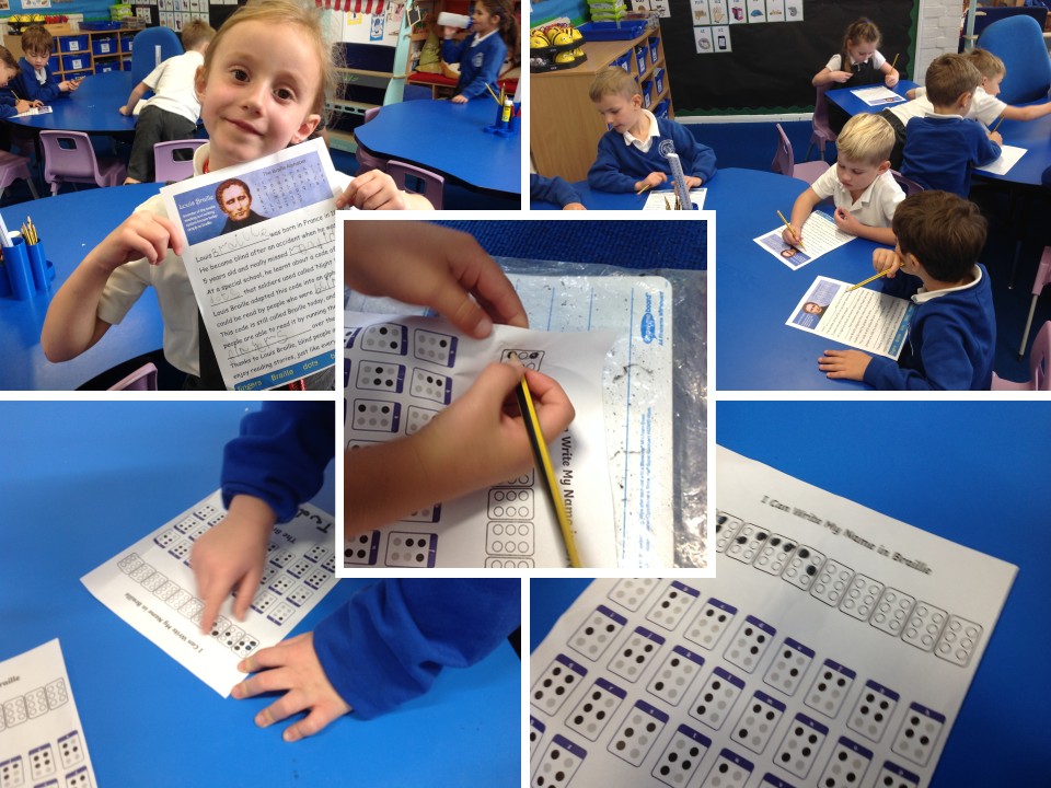 Our People Project subject for this term's 'How to Change the World' theme is Louis Braille. First, the children heard the story of Louis Braille, who became blind after an accident as a young child. He learnt about a system of writing using twelve raised dots, developed to enable French soldiers to read messages at night. He refined this into a far more efficient six dot system, which is still used to allow blind people to read nearly 200 years later. The children completed a fact sheet and even wrote their names using the Braille alphabet.