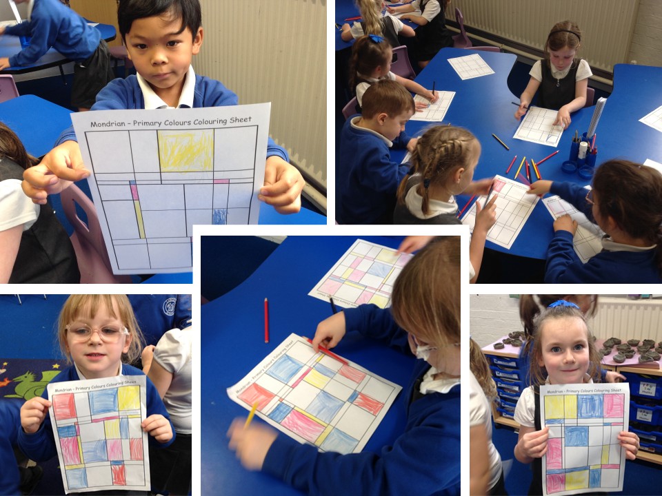 After talking about which three colours were the primary colours (and why), we looked at a number of paintings by Mondrian which use simple blocks of primary colour alongside black and white lines and squares. The children then had the opportunity to create their own Mondrian-inspired works, using only primary colours to fill their own grids.