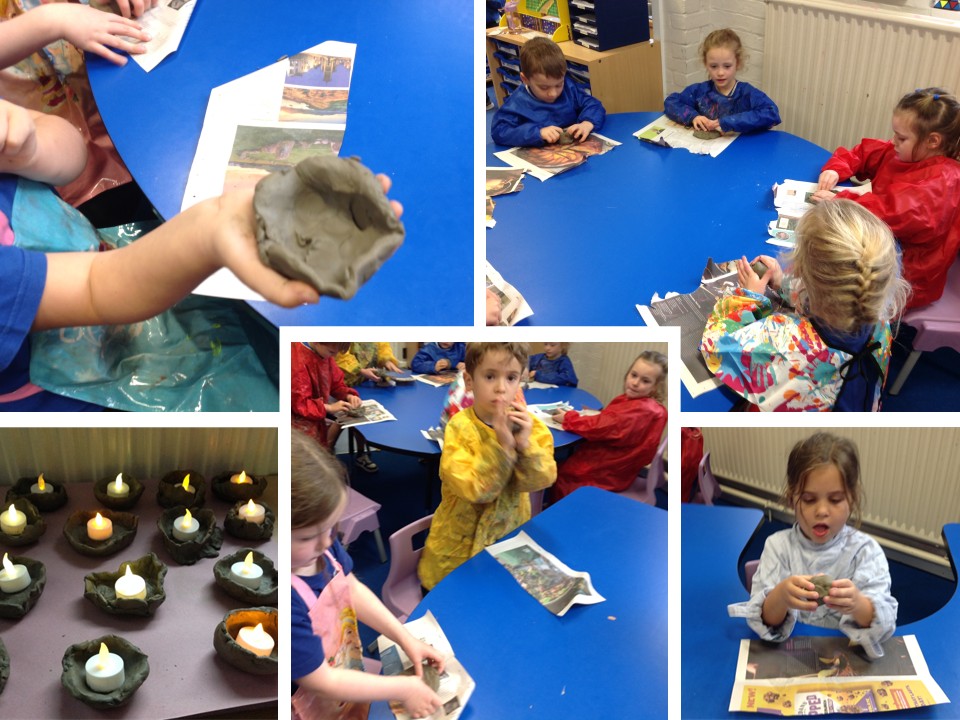 We began by learning about the Hindu festival of Diwali, hearing the story of Rama and Sita and looking at how lighting diya lamps represents the triumph of light over darkness and good over evil. We then made our own diya lamps out of clay which we'll be decorating next week.